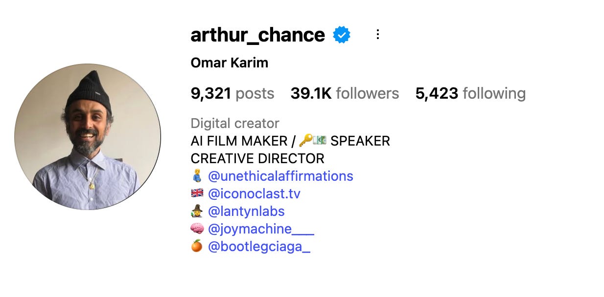 I have known Omar Karim for a few years, his work sits at the pointy end of creativity and LLMs (what the general public calls AI). He creatively uses the ‘glitches’ in video generating models and has impeccable taste. You can see his work on Instagram under the handle @arthur_chance